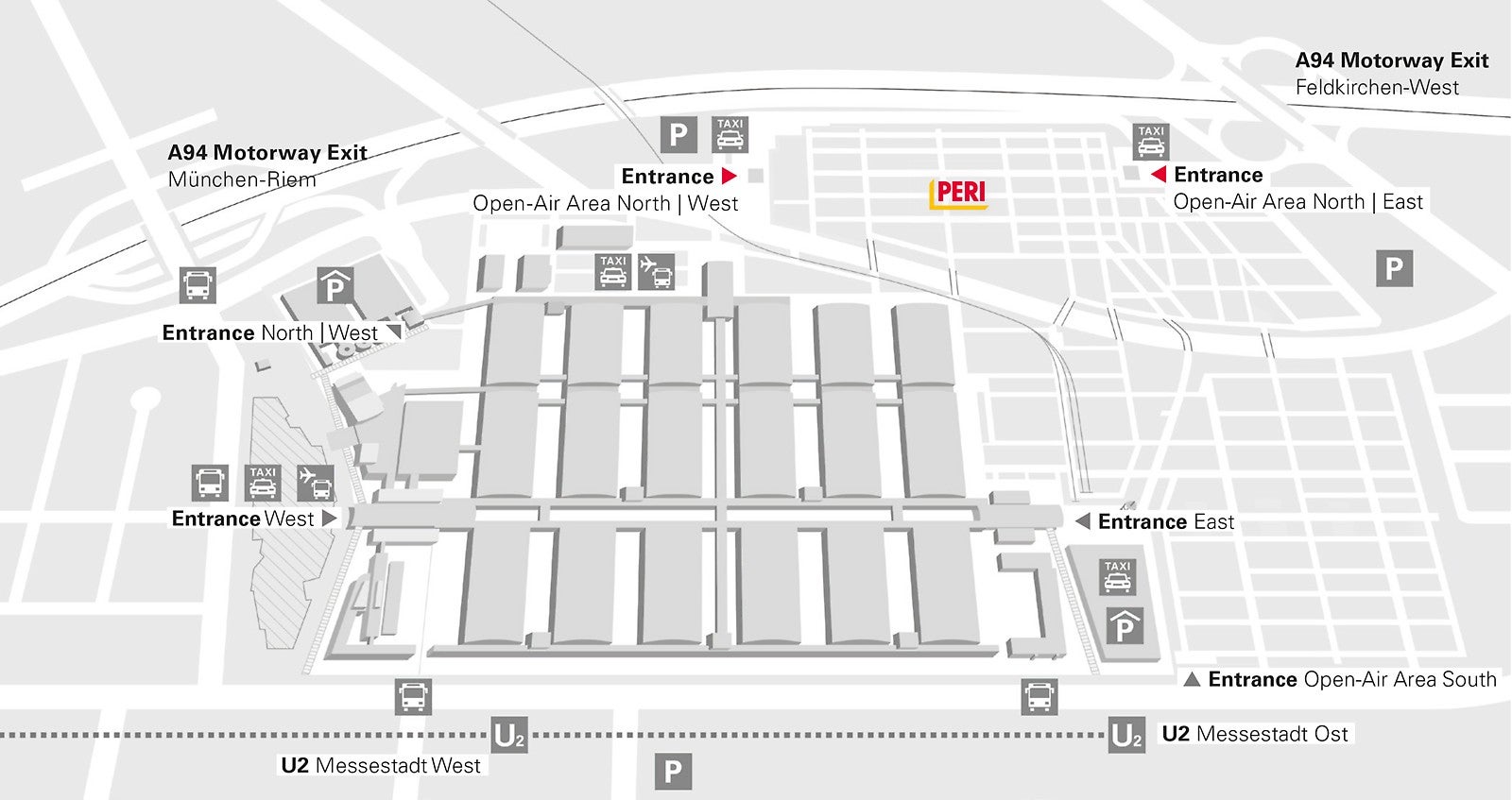 展览场地位于 A 94 高速公路上,请遵循时事交通管理系统的指示,您的导航系统只能作为参考。